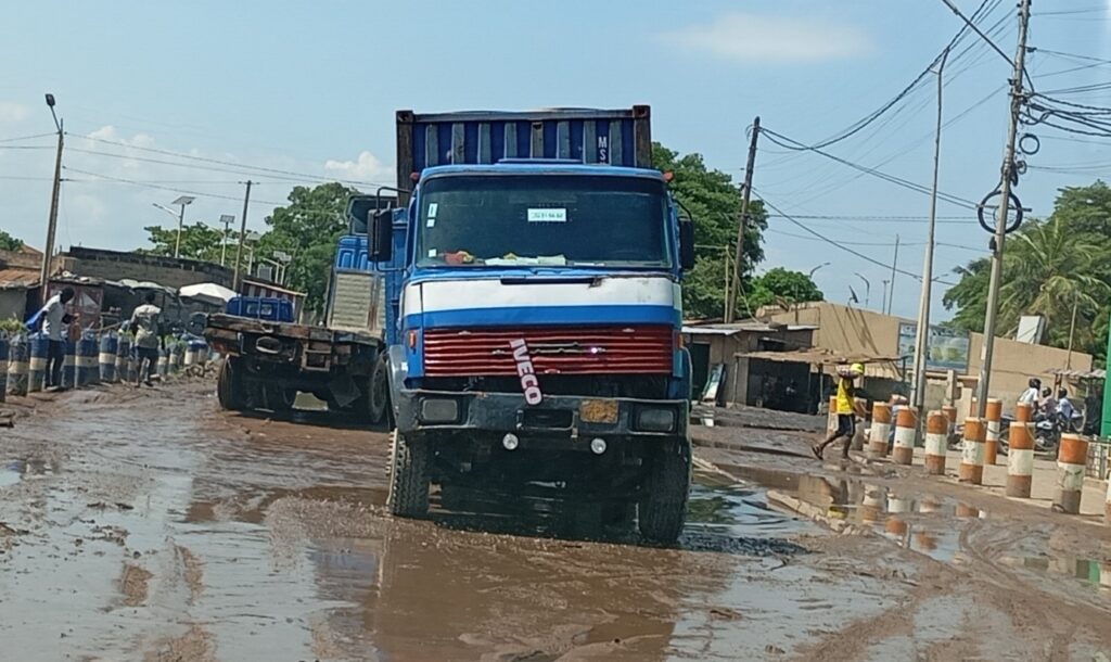 Ainsi les routes d’accès du « seul port en eau profonde » de l’Afrique de l’Ouest qui devrait servir le développement devient à ce niveau une torpille qui fait tomber les camions transportant les marchandises et souvent avec des conteneurs vides et pleins. On observe chaque année et à chaque saison de pluie, du mois de mars à juin et de septembre à fin octobre, les mêmes scènes macabres sous les regards indifférents et voir cyniques des dirigeants et aussi des grands acteurs économiques qui rodent dans les environs.